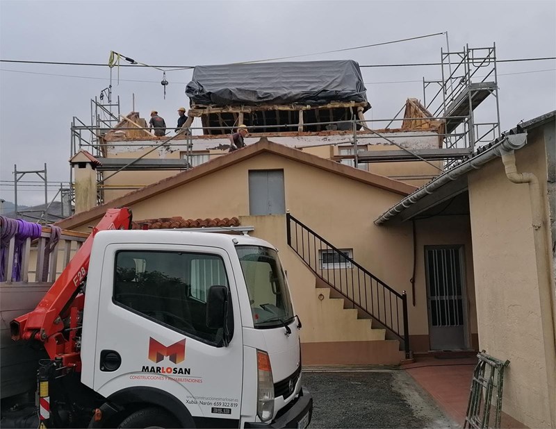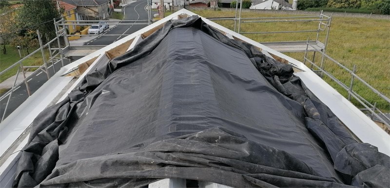 La intervención en la cubierta consistió en el desmontaje de la cobertura existente, reducción de altura de hastiales, formación de zuncho perimetral y aleros, colocación de viguetas y sobre ellas planchas de fibrocemento ancladas con ganchos, terminando con la colocación de teja árabe fijadas con ganchos de acero inoxidable. En el intradós del fibrocemento se proyectará poliuretano proyectado CC4 (celdas cerradas) hasta alcanzar un espesor de 5 cm.
