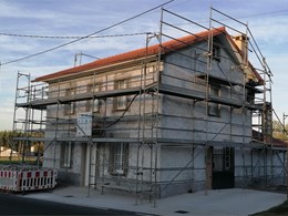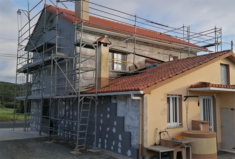 La intervención en la fachada consiste en un sistema de aislamiento térmico exterior (SATE), paneles de aislamiento térmico de poliestireno expandido grafito de 6 cm de espesor y revestimiento final con mortero acrílico-mineral Reviquarz G10.